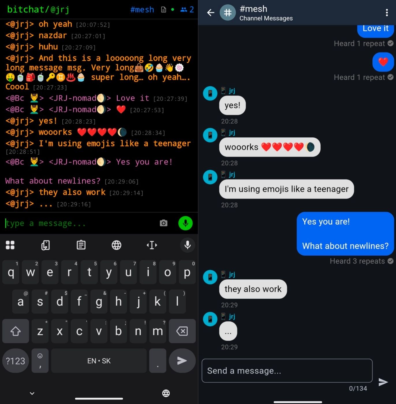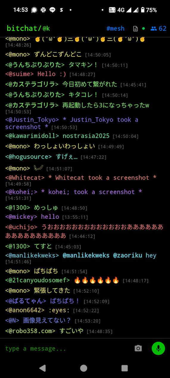 この仕組みがインターネットに依存していないため、インターネットが遮断されているときに政治デモやフェスなど同じ場所にいる集団がコミュニケーションを取ったり、あえてインターネットから隔離されたローカルなコミュニケーションを取りたいときに有効です。しかもIDは使い捨てることもでき、DM機能はエンドツーエンド暗号化されているので匿名性という意味でもそこそこ使えます。