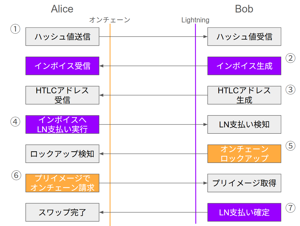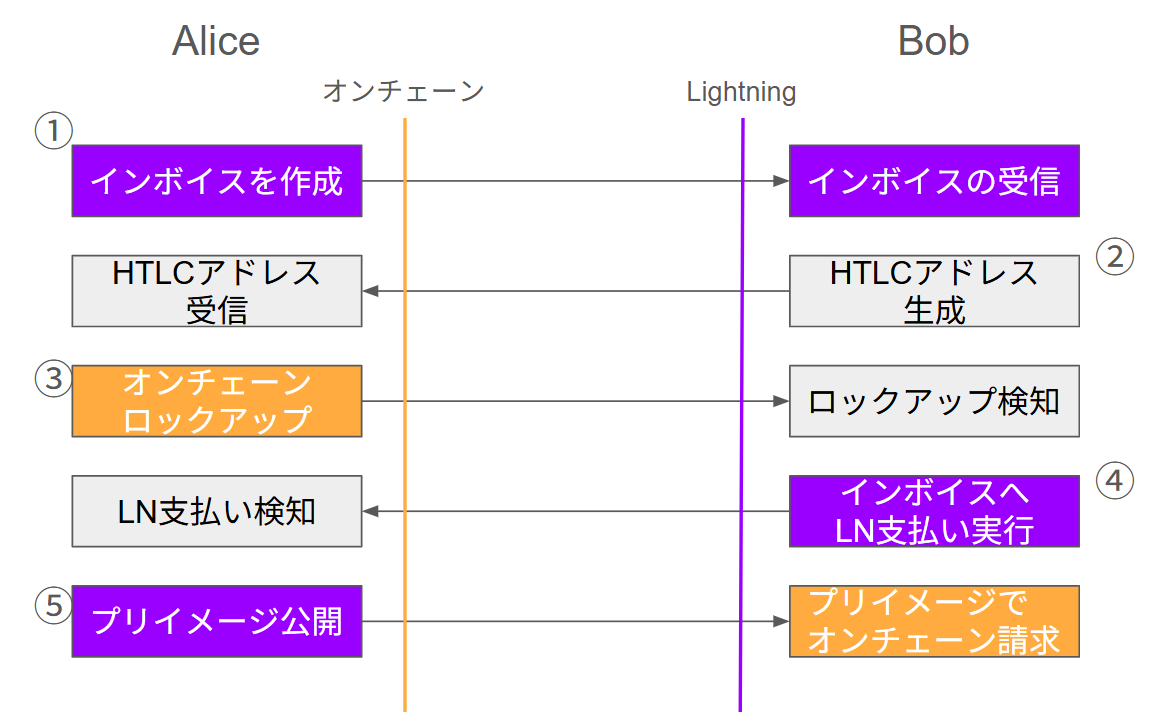 ここでは例として、AliceがオンチェーンBTCをBobに送金し、その見返りとしてBobからLightningで支払いを受け取る、Submarine Swapの流れを説明します。