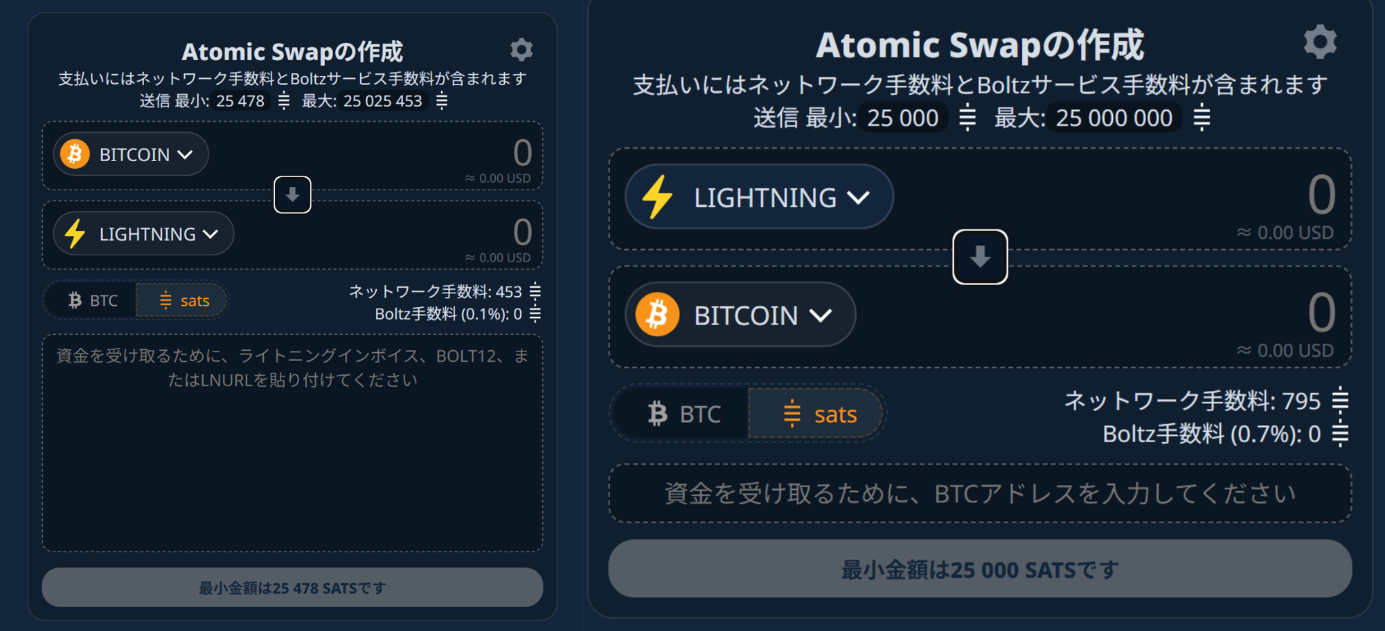 左はSubmarine Swap(オンチェーン → Lightning)、右はReverse Submarine Swap(Lightning → オンチェーン)を実行する際の、BoltzのWeb App(フロントエンド)の画面です。