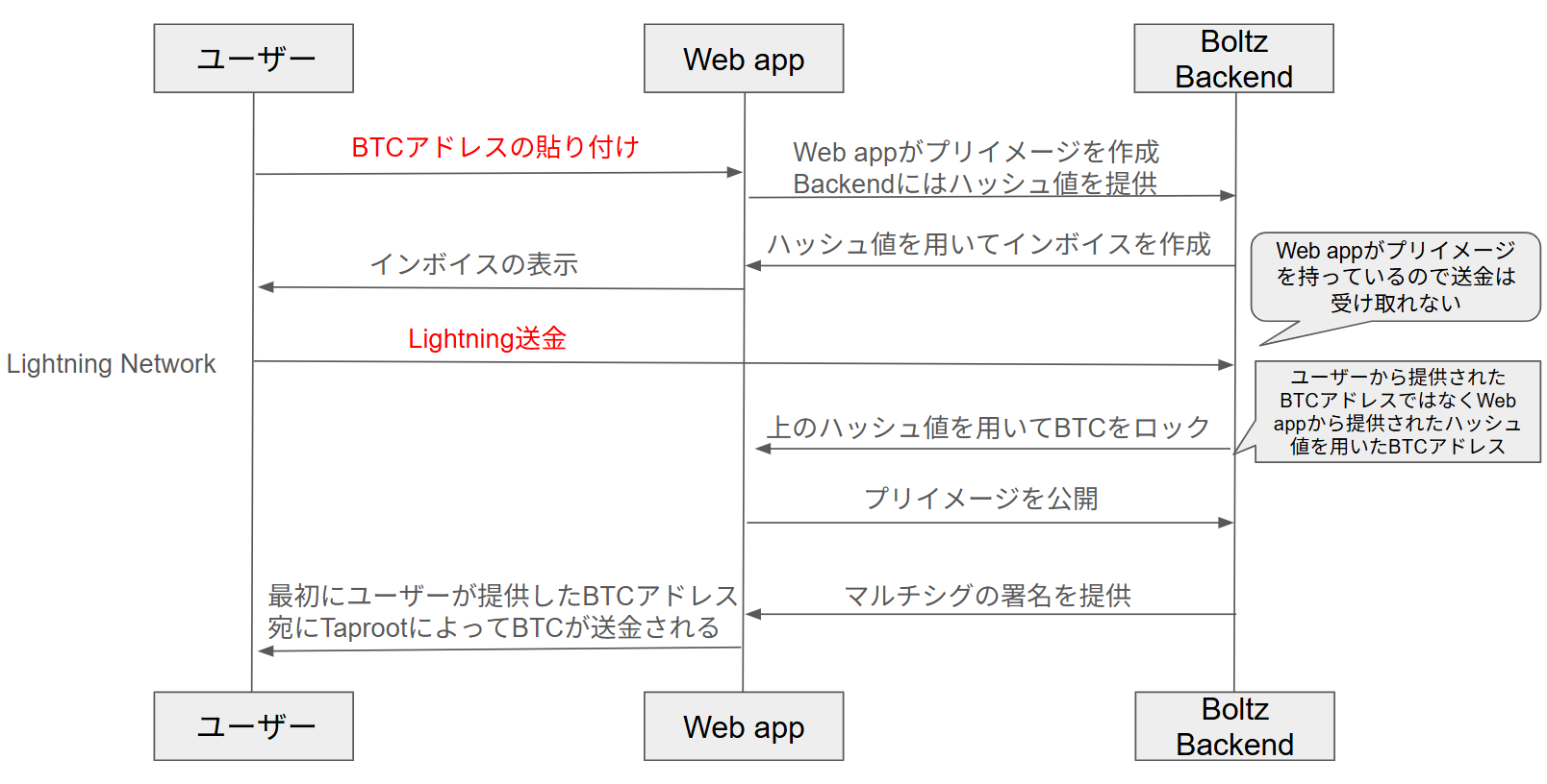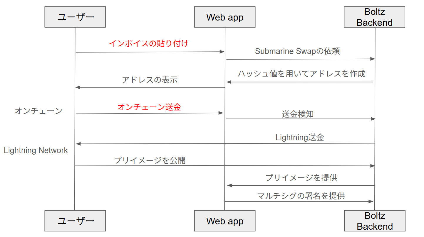 ユーザーが直接操作するのは、赤色で示した 「インボイスの貼り付け」と「オンチェーンでの送金」の2点のみです。それ以外の処理は、Web appとBoltz Backend、オンチェーン、そしてLightning Network上で自動的に進められています。