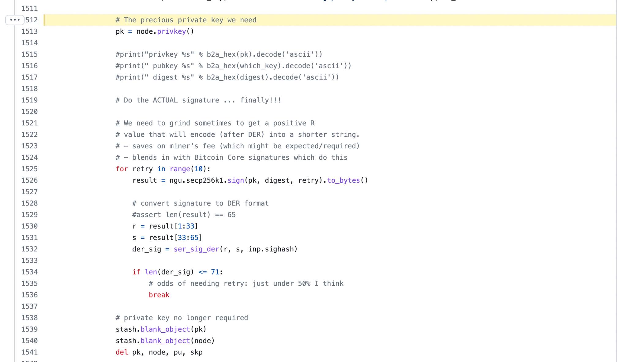 さらに下の方を見てみると,1513行目にpk = node.privkey()と書かれています(Fig. 4)。そして1526行目にresult = ngu.secp256k1.sign(pk, digest, retry).to_bytes() の部分が楕円曲線暗号で署名している部分となります。