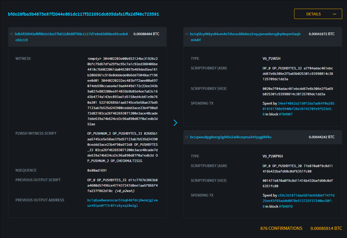 まずは最初のトランザクション、入金するためのトランザクションです。下図のトランザクションの0番目のアウトプットが2-of-2マルチシグでロックされていますす。1番目のアウトプットはただのお釣りです。
