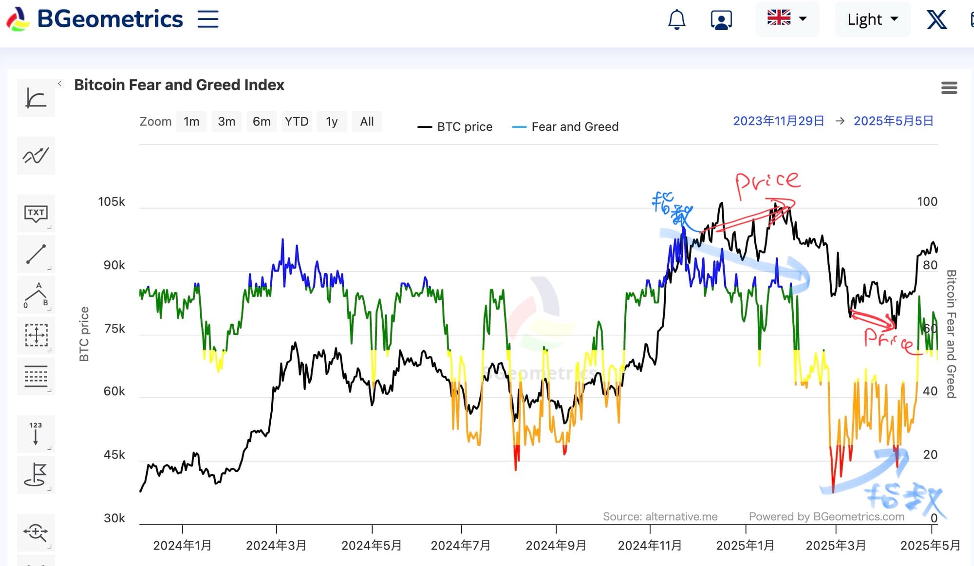 対照的に2025年3月から5月にかけては、ビットコイン恐怖指数が底値を割り込めず右肩上がりとなったにも関わらず、値段は下落を続けていました。