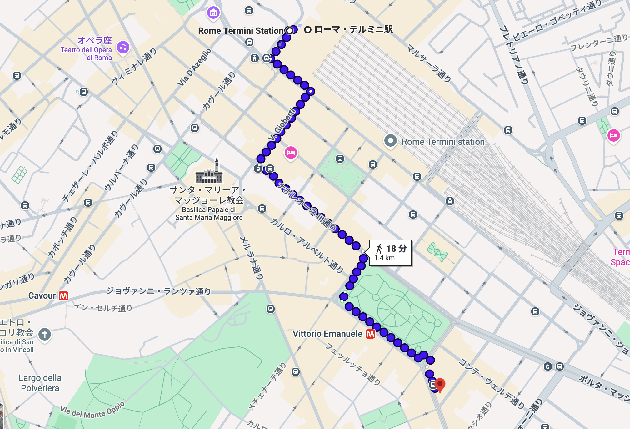 ローマの中心的な駅の一つであるテルミニ駅の正面口から徒歩20分程度の場所にあり、街の雰囲気を知るためにもテルミニ駅から歩いていくことにしました。