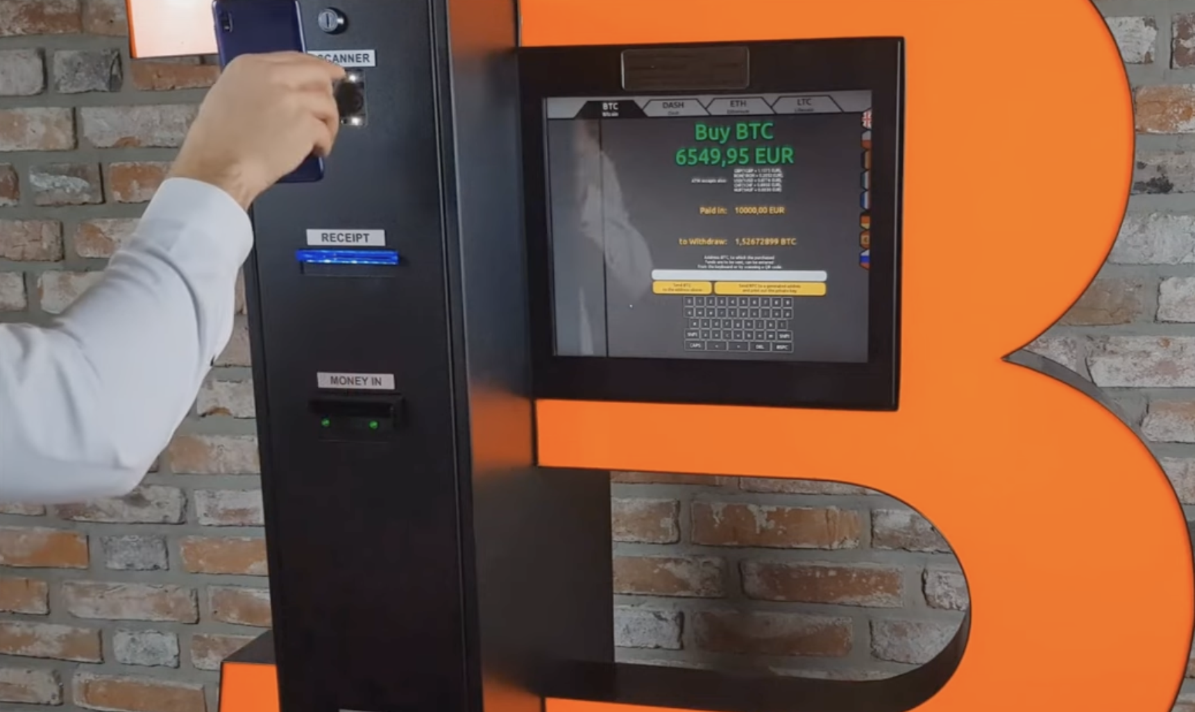 そんなことは知らずにとりあえず5ユーロ札を突っ込んでみると、受取用のアドレスの入力が求められました。おそらくオンチェーンのみに対応しており、Lightningには対応していないようでした。自身のスマホでウォレットを開いてアドレスのQRをカメラに読み取らせると処理が進みました。
