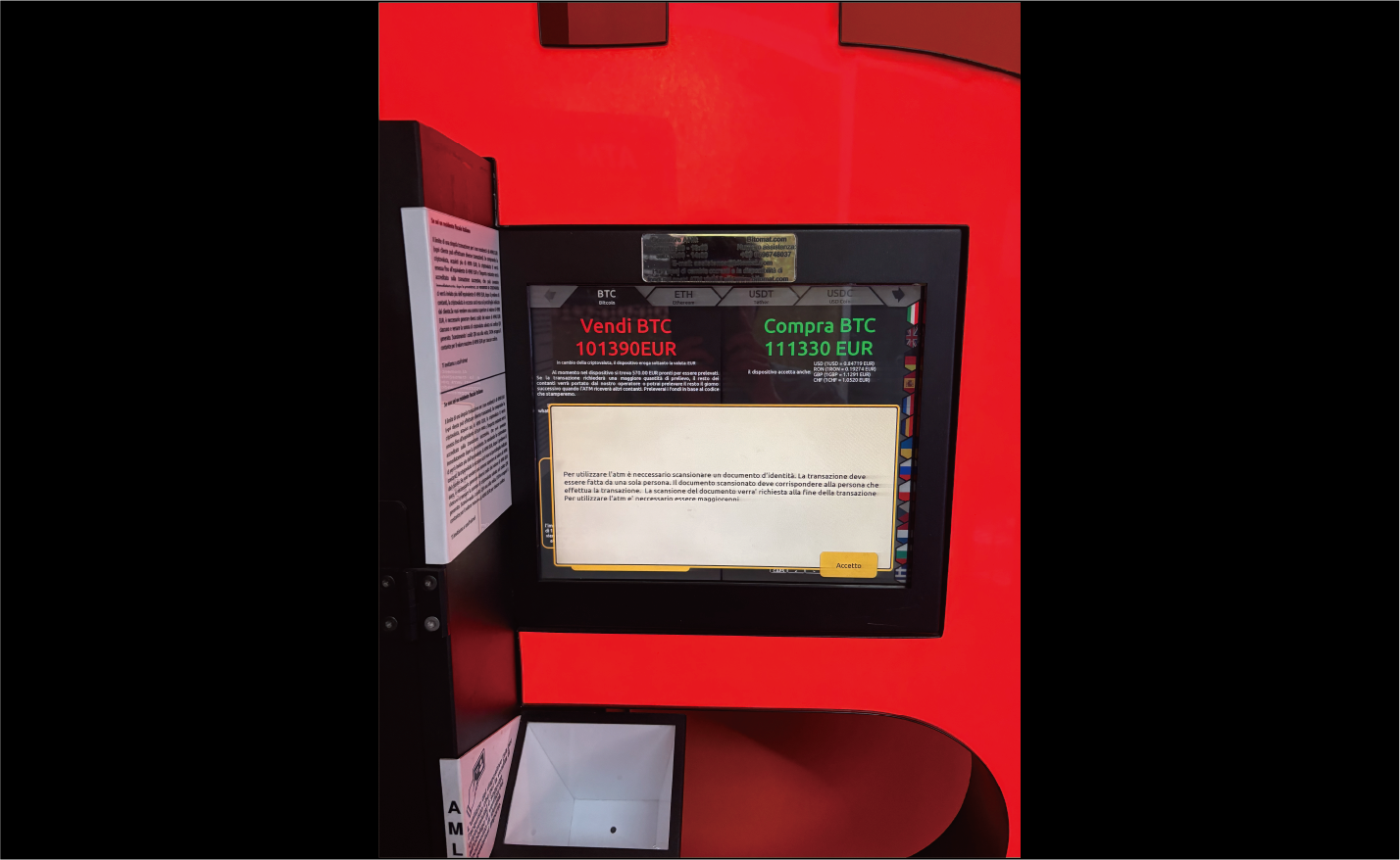 サイバーパンク感のあるデザインと滅多にない体験で興奮しましたが、EU圏内での暗号資産に対する締め付けを体感しました。ビットコインATMだけでなく、イタリア旅行先の各所でビットコイン支払い可能なお店を探していましたが、その数は少なく、イタリアでもまだまだビットコインの産業は未発達な印象を受けました。