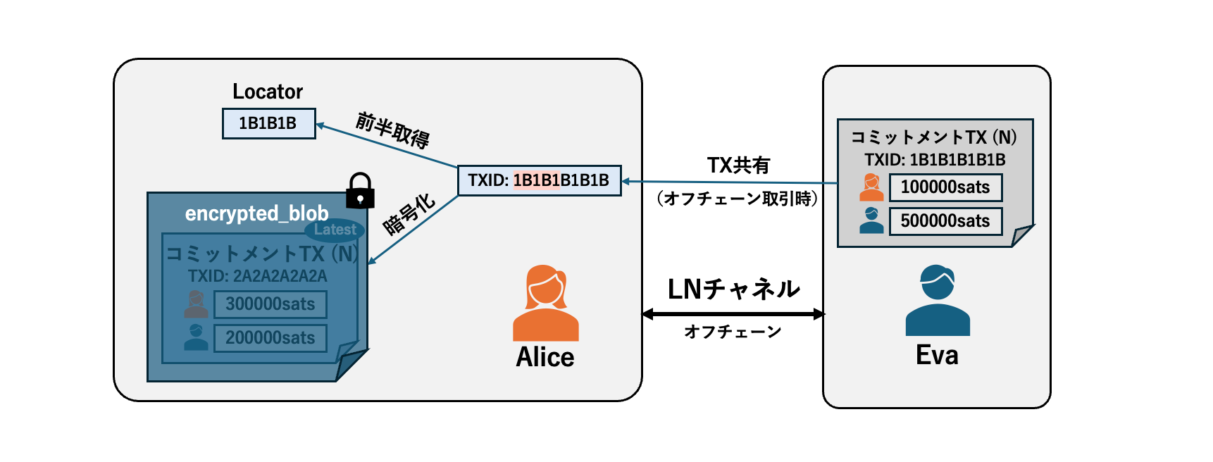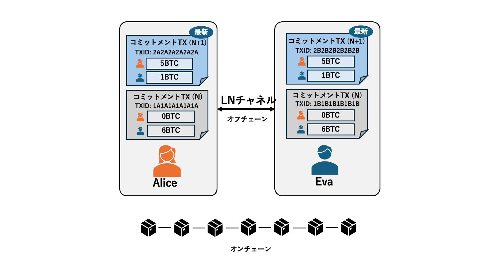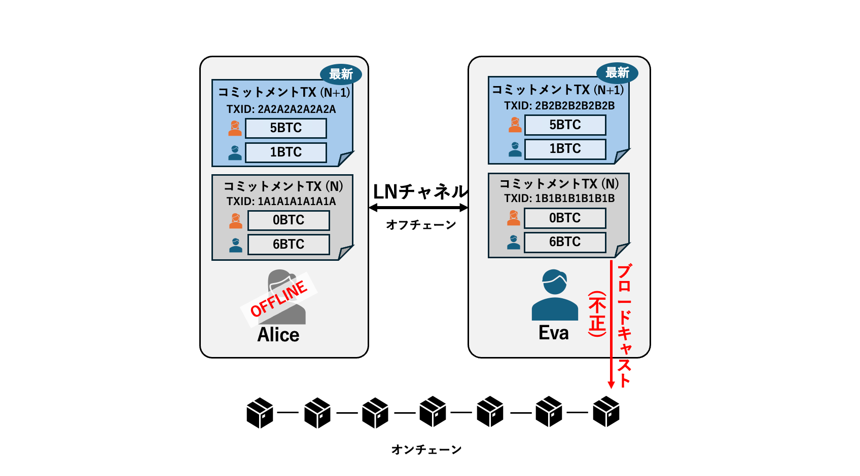 この状態でAliceが気をつけるべきことは、Aliceのオフライン時にEvaが古いコミットメントTX をオンチェーン上に公開し、Evaが不正に得をした状態でチャネルを強制的に閉鎖する状況です。(いわゆるUgly Way)