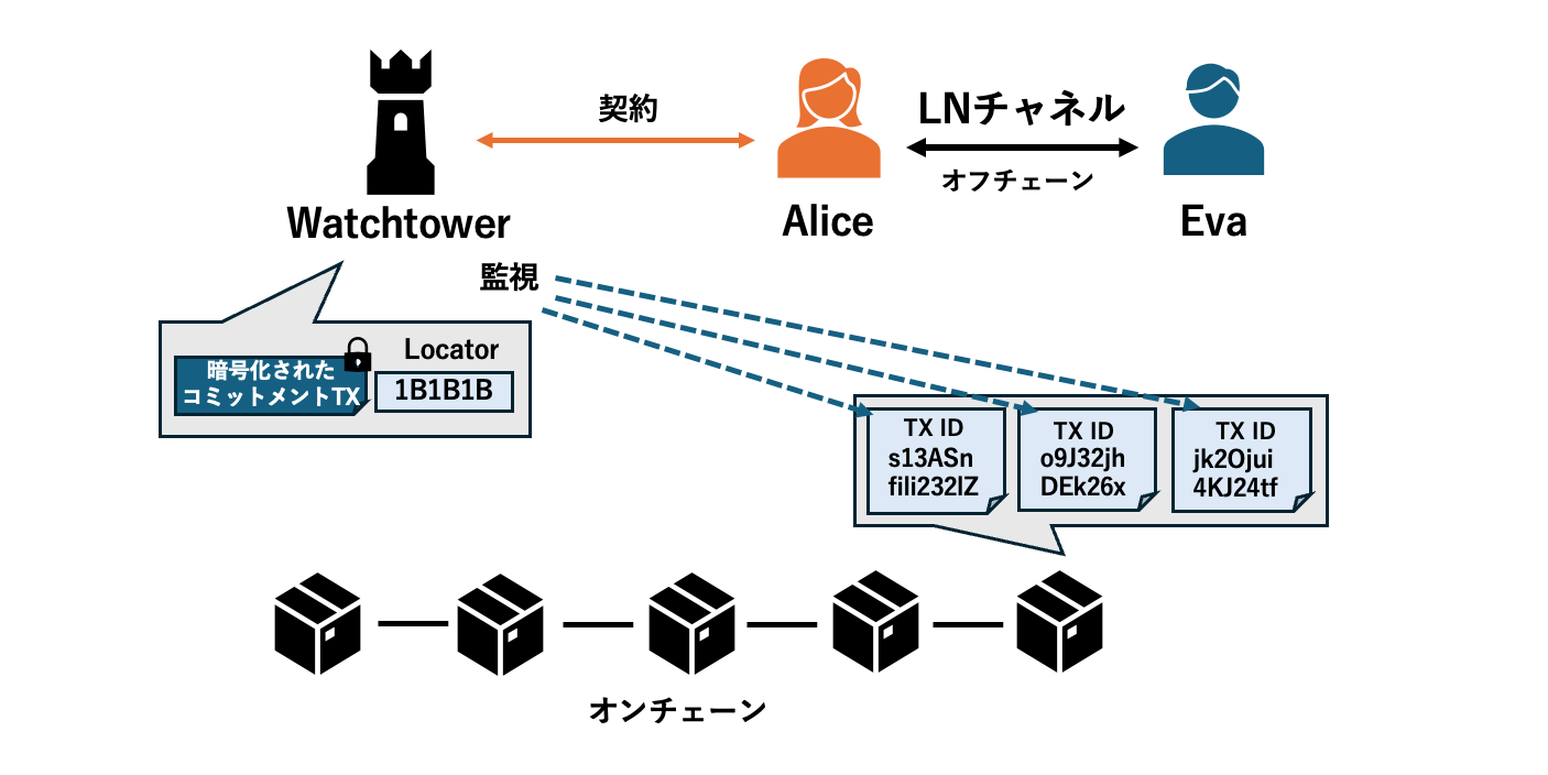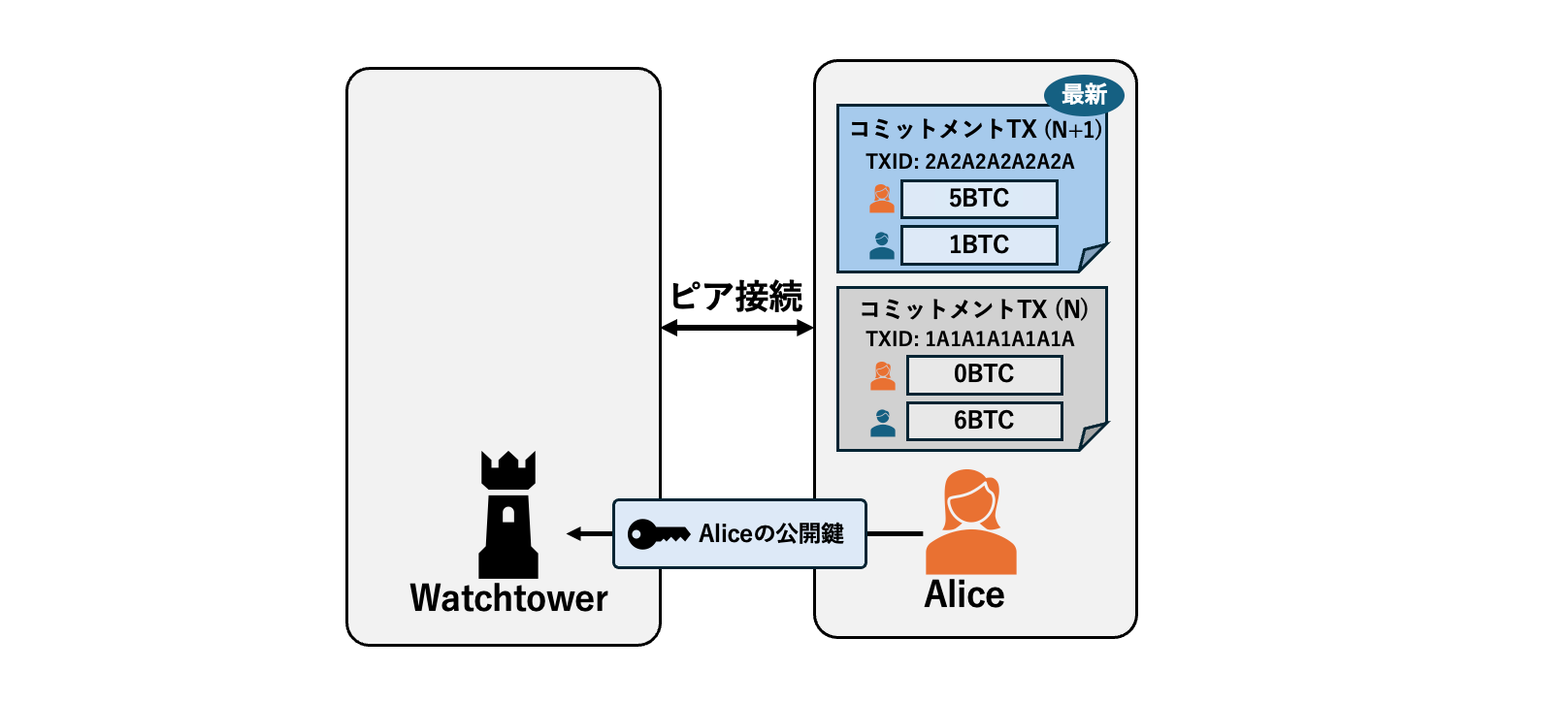 - Alice: オフラインになる想定でWatchtowerに監視保護を委託するユーザー (Watchtowerクライアント)。