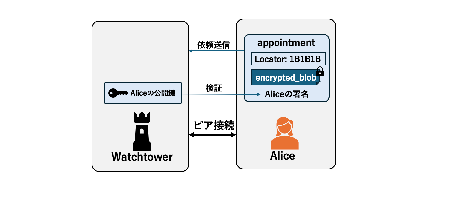 さらに、この appointment データに対して Alice の署名を加えて、Watchtower に対して送信します。Watchtower は「2. Watchtowerへの認証情報の登録」時にAliceから共有された公開鍵で署名検証を行いappointmentデータの認証を実施します。認証に成功するとWatchtowerはそのappointmentを保管します。