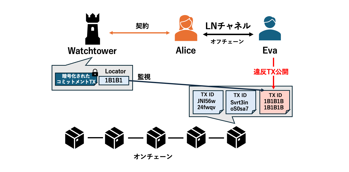Watchtower はオンチェーン上のトランザクションを監視し、Locator と一致する TX ID がないかを常時監視します。