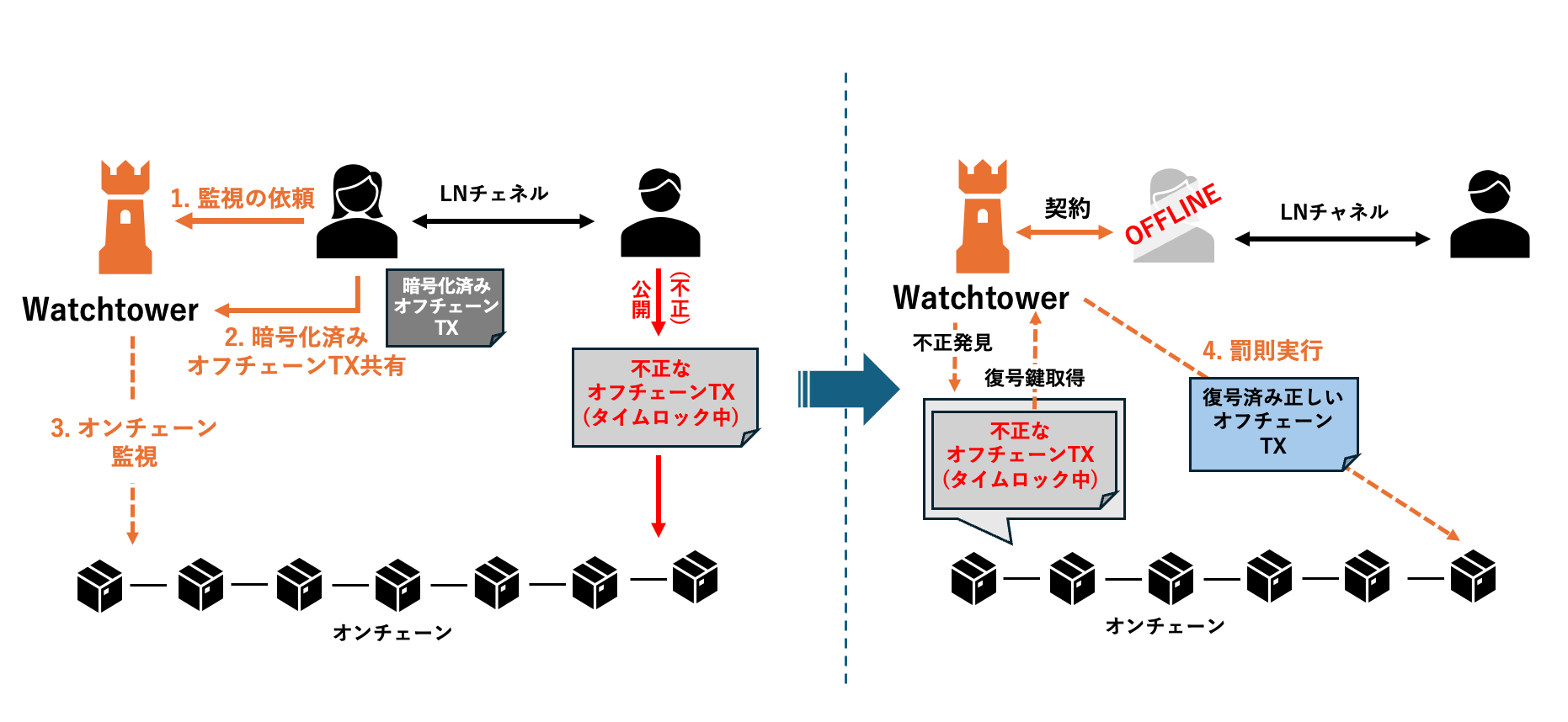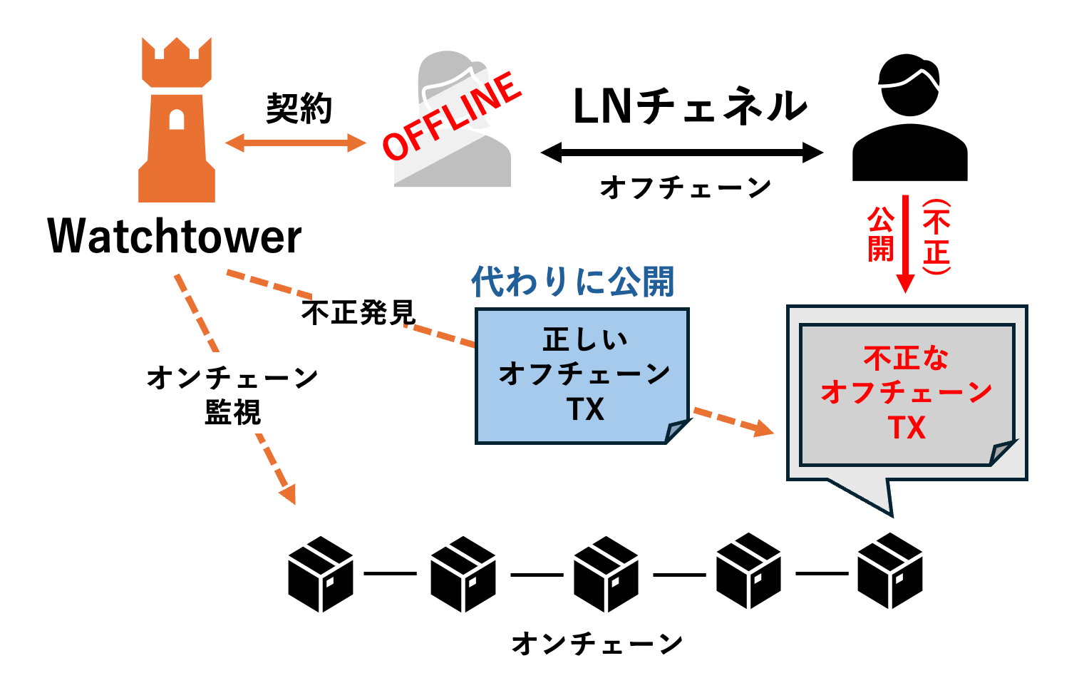 LNノードがオフラインになってしまうことに備え、保険的に採用されるのがWatchtowerです。