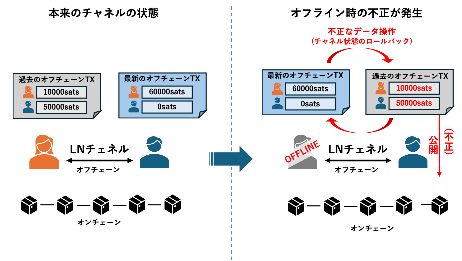 LNでは、LNノードオフライン時にチャネル相手によってチャネル資金を奪われる恐れがあります。