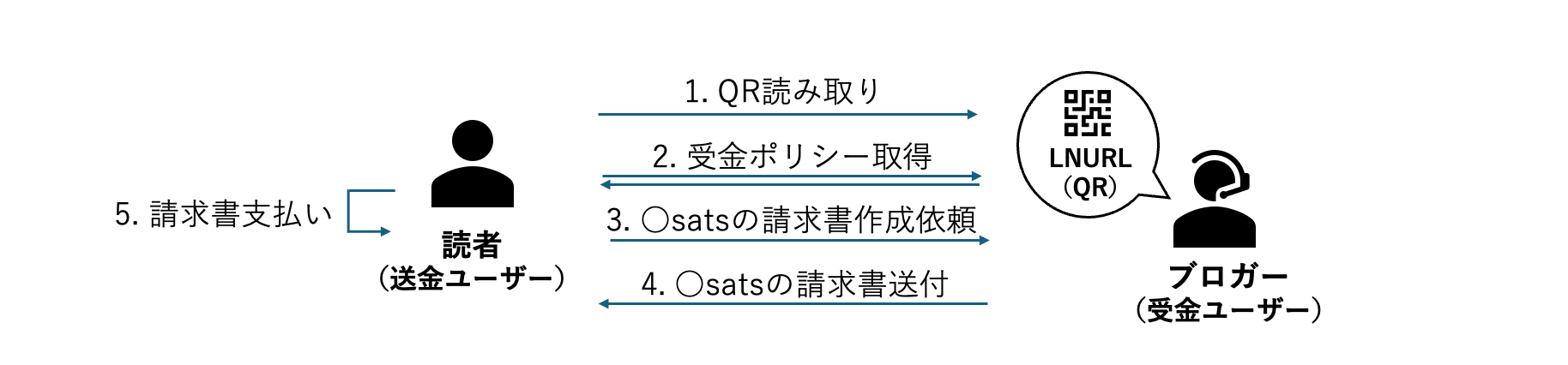 受金ポリシーの情報をもとに、読者はcallback項目で指定されたURLにインボイスのリクエストを投げると、ブロガーのLNURLサーバーが自動でインボイスを作成し読者に返送します。これにより、読者はブロガーに対して投げ銭したい金額に応じたインボイスを受け取ることができ、送金が可能な状態になります。