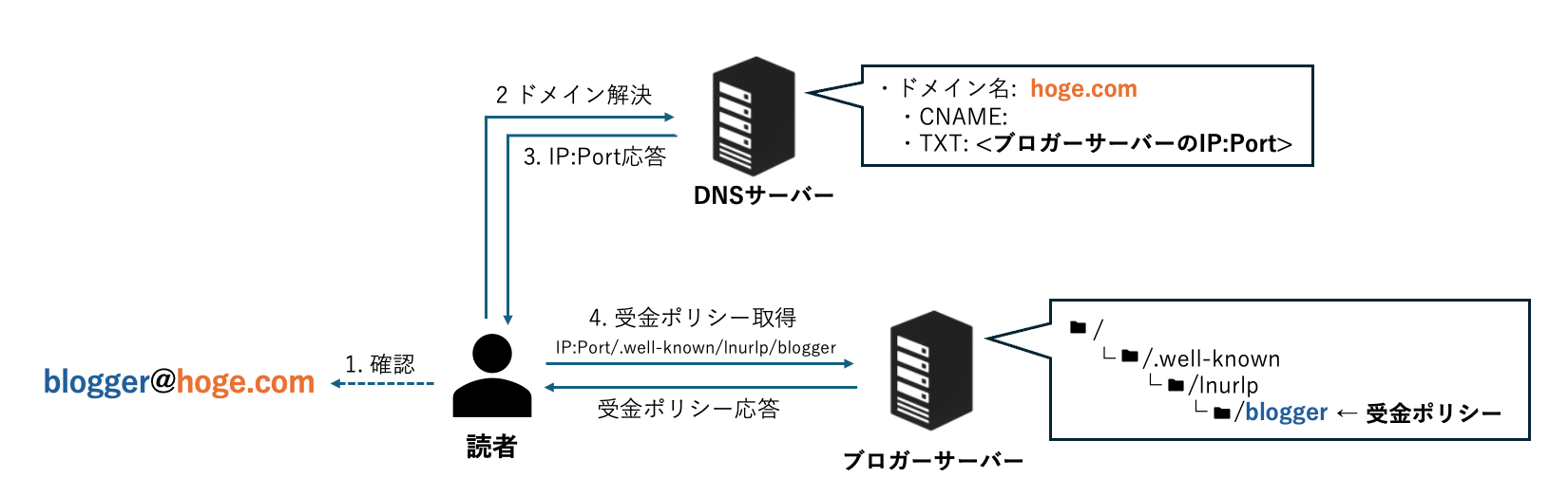- 読者はドメインから取得したIP:PortとLightning Addressの前半文字列をもとに、ブロガーサーバーのIP:Port/Pathに接続し、ブロガーの受金ポリシー情報を取得します。