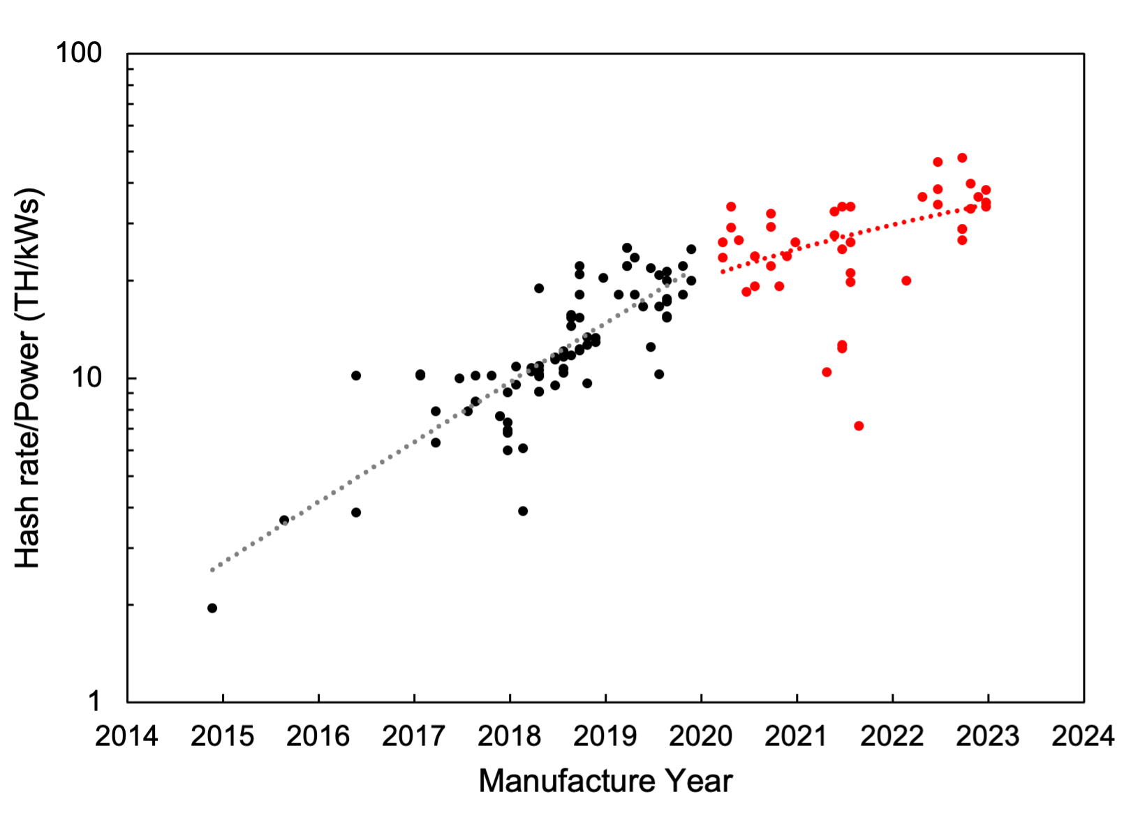 黒いプロットが2020年1月までのデータ,赤いプロットが現在までのデータです。2020年まではムーアの法則に従ってほぼ18ヶ月で2倍のペースで伸びていますが,最近はペースが減速傾向にあります。2020年5月11日にマイニング報酬が6.25 BTCに減少したことや,世界的な半導体不足,ビットコイン価格の下落などが影響しているのでしょう。