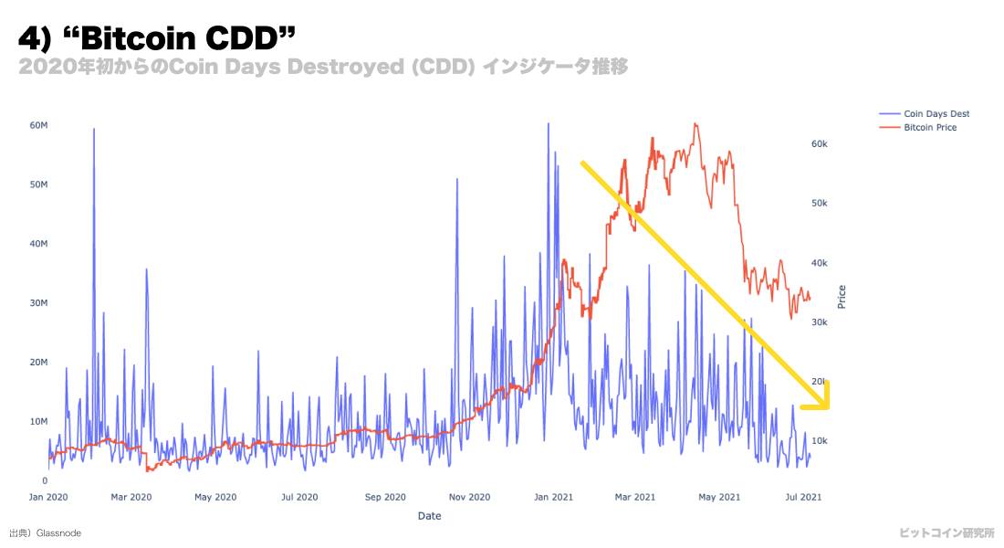 図4にある「CDD」と呼ばれるインジケータは、その日に起こったコインのトランザクション数をUTXOの最終更新日で掛け合わせた指標です。この指標を確認することで「ビットコインの長期保有者がコインを手放ししているか」が分かります。CDDは年初から下がり続けているので、ビットコインの長期保有者は総じてコインを動か(売却)していないことが分かります。