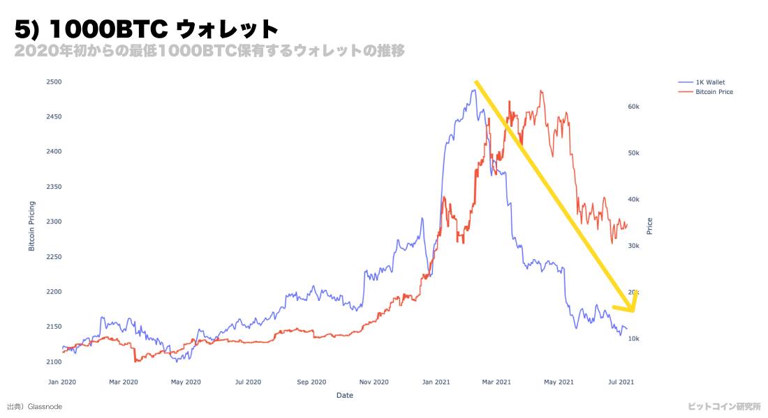 一方、図5にあるホエールウォレット(ここでは1000BTC以上をホエールの定義とします)を見ると逆に3-4万ドルを超えたあたりから減少が始まっていることがわかります。CDDとは逆で、この指標が下がっていることは利益確定した大口投資家がコインを放出していることを意味します。