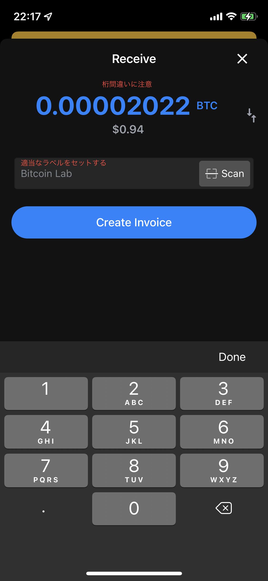 - [受ける側] ウォレット上で(金額を指定して)インボイス(QRコード或いはlnbc…という文字列)を発行する