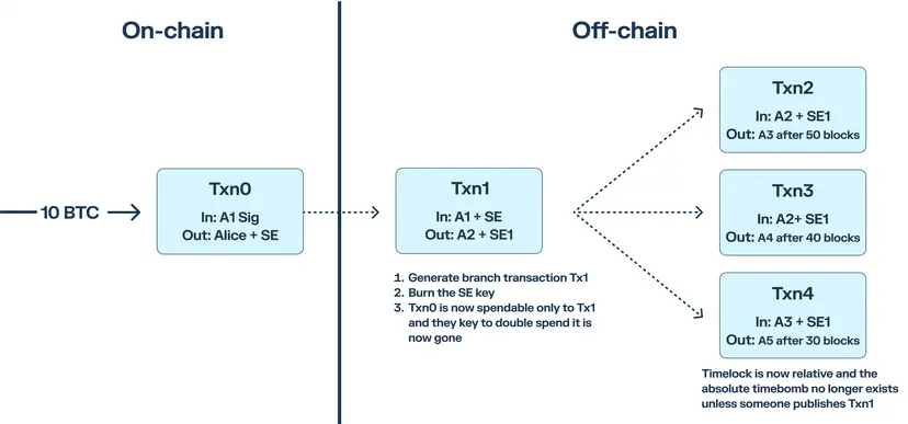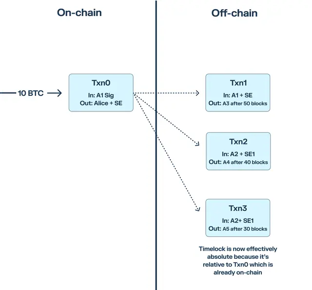 さっきの図ではStatechainの寿命であるタイムロックはオンチェーンTxn0にかかっていたため、Statechain作成時点で決定してしまい時限爆弾となっていました。一方、Spark TreeにおいてはタイムロックはオフチェーンTxn1において規定されているため、Statechainが強制決済されるまでカウントダウンが始まりません。これによってStatechain強制決済時の処理を効率的に詰めることができ、1つのSparkで処理できるトランザクション数が大きくなります。