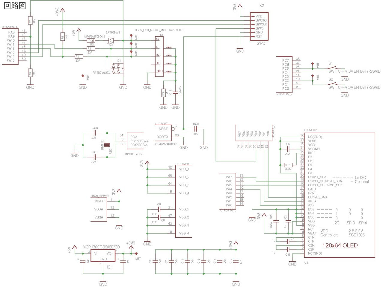 「trezor_v1.1.sch.png」を開いてみます(2枚目の画像)。右下に鎮座している大きな四角がディスプレイ,上部中央付近にある「USB...」と書かれているものがUSBコネクタ,右のS1,S2はボタン用のスイッチです。そして「U1○○○」と書かれているものがいくつかありますが,これは実際には一つの部品です。端子が多いので回路図上では分割して記載されています。これがマイコンとよばれるものです。