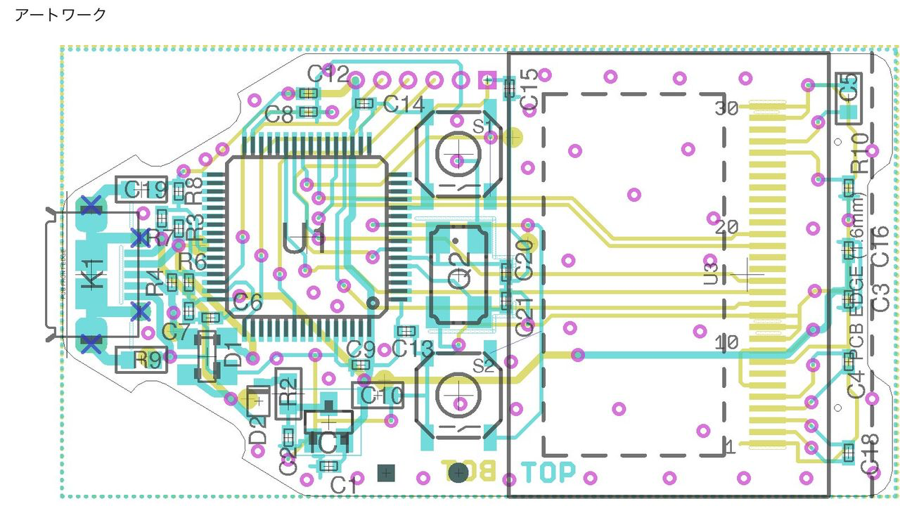 小さい基盤にギュウギュウに電子部品が詰め込まれています。実際の設計ではアートワークをいきなり設計し始めるとごちゃごちゃしすぎるので,回路図から設計をします。