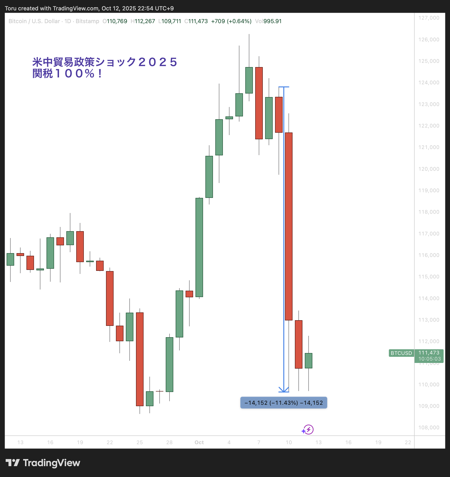 2025年10月の下落では、約11.45%の下落にとどまりました。関税100%という衝撃的なニュースにも関わらず、値下がり幅は小さかったともいえます。