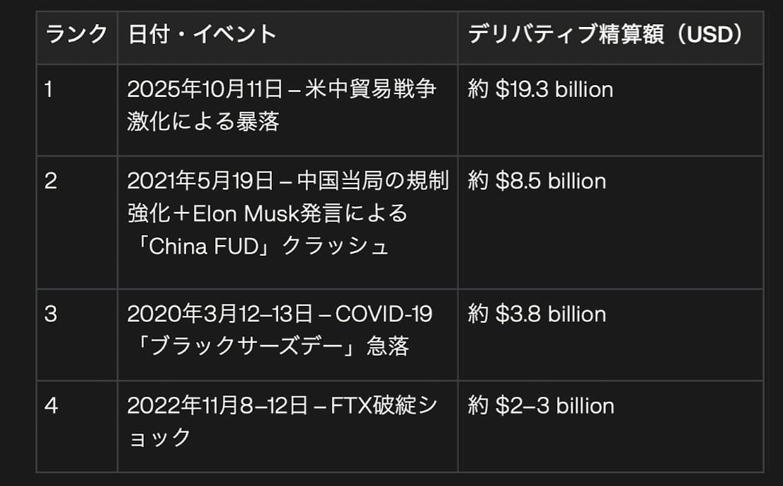 2025年10月のビットコイン暴落では、米中貿易政策ショックをきっかけに過去最大となる約193億ドルものデリバティブ強制決済が発生しています。