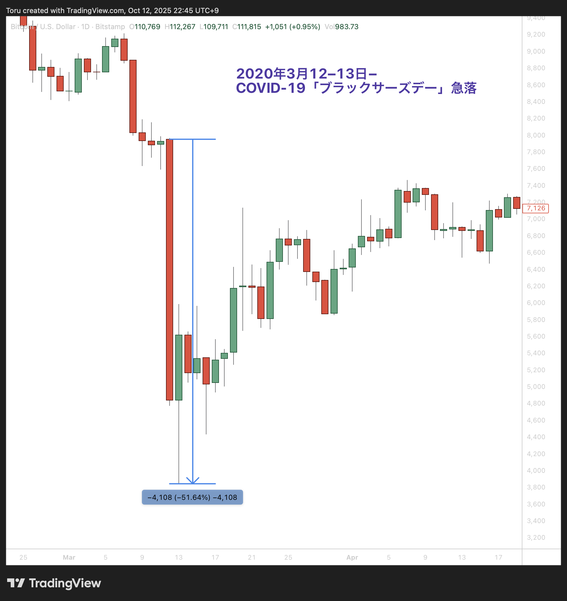 例えば3番の「2020年3月12–13日 COVID-19ブラックサーズデー急落」などは、酷かったですよね。