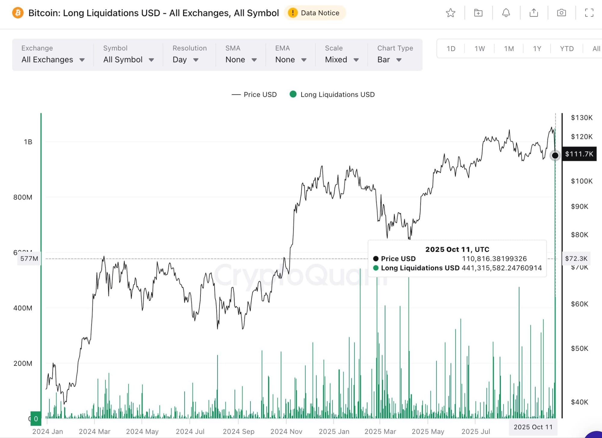 上の図はビットコイン価格(黒線)と清算額(緑の棒グラフ)を示しています。2025年10月10日を含む数日間で、過去最大規模の清算が発生しています。ところが、値動き自体は極めて限定的でした。