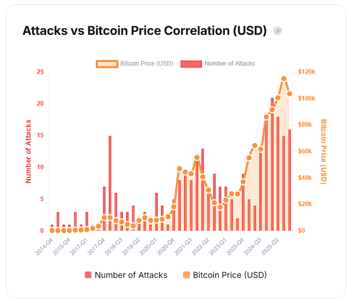 レンチ攻撃はビットコイン相場が盛り上がった年とその翌年に増える傾向があり、ビットコインの普及と価格上昇とともに増加傾向にあります。