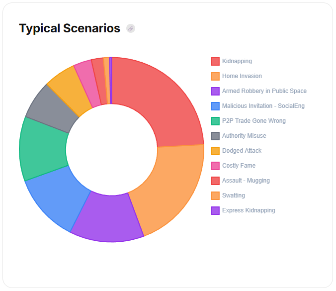 国によっても傾向があるかもしれませんが、世界的には「1.誘拐」「2.家宅侵入強盗」「3.路上強盗」「4.ソーシャルエンジニアリング・待ち伏せ」「5.P2P取引時の事件」が最も多いそうです。(これらは1つの事件で複数該当することもあるタグのようです)